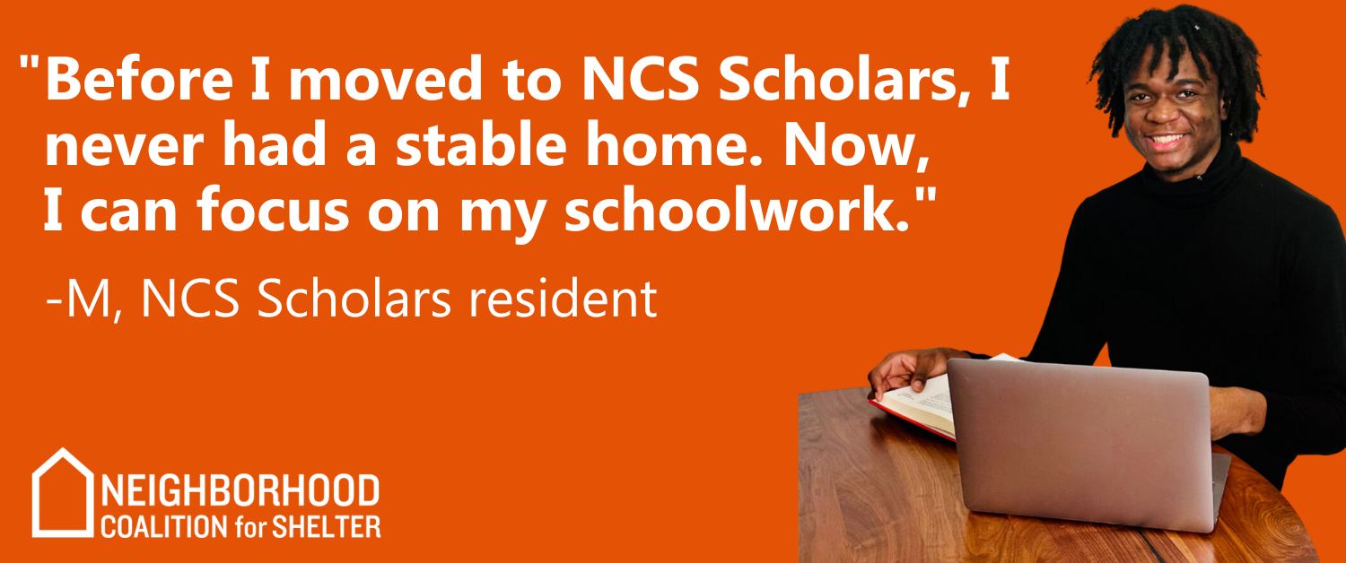 We created NCS Scholars to help students like M succeed. Today, he has year-round housing, on-site support, and is on track to achieve his goals.